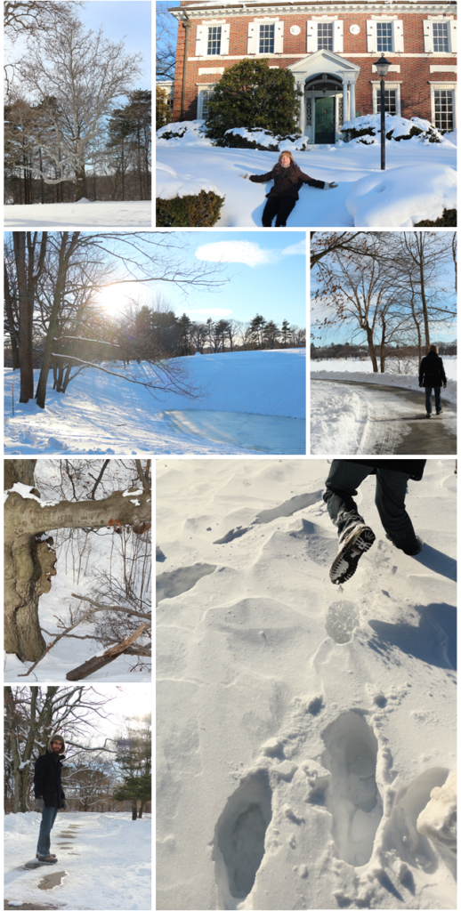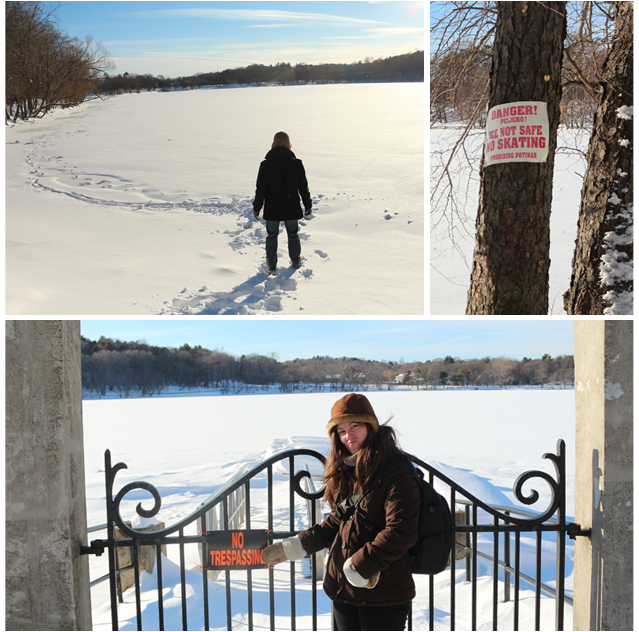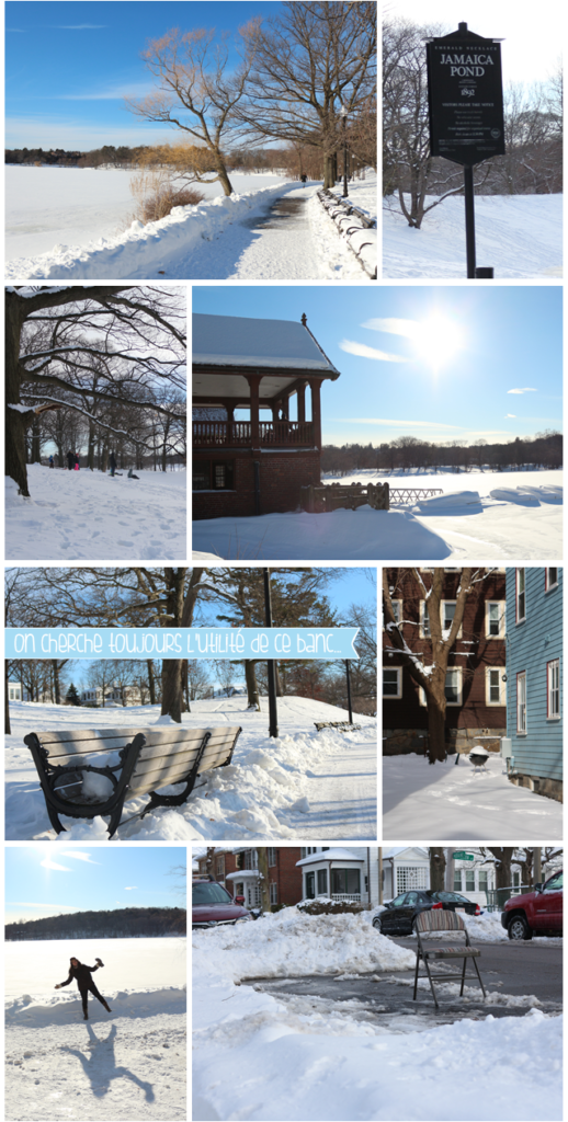Avant d’accéder à l’étang, on traverse Jamaica Plain, petite ville très mignonne avec plein de maison colorées. Hiver oblige, les habitants déneigent trottoirs et place de parking, ce qu’ils détestent tous… Du coup, pour ne pas laisser les autres profiter de leur dur labeurs (dans le froid en plus), certaines places de parking se voient réservées grâce à des chaises/tabourets en tout genre…