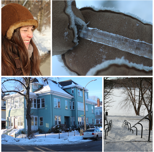 Le soleil est au rendez-vous et comme d’habitude, il ne réchauffe pas mais éclaire très très fort. On est d’ailleurs toujours aussi étonné qu’il fasse aussi lumineux dans cette partie des États-Unis. En tous cas, je ne m’attendais pas à retrouver le soleil en partant d’Antibes (non, on a oublié les lunettes à l’appart pour aujourd’hui)… On crois également de gros morceaux de glace, des stalactites qui peuvent vous tomber sur la tête, on voit d’ailleurs assez régulièrement en ville des panneaux nous indiquant de faire attention au chutes de pics de glace provenant des toits.