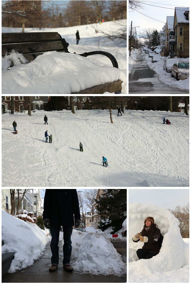 Les rues sont toute blanche, les bancs aussi, et sur une grosse épaisseur, on ne peut pus s’assoir. Qu’à cela ne tienne, c’est l’occasion pour les petits mais aussi les grands, de sortir luges (et bouées) pour de belles grandes descentes. C’est aussi le temps parfait pour la fabrication de bonhommes de neige. Nous, on s’installe tranquillement dans une espèce d’alcôve pour faire comme si on était dans les embouteillages de Nice (oui, je klaxonne sur cette photo à droite…). Doudou nous montre la hauteur de la neige dans la rue, avec les tranchées… Ah, on me fait signe que ce sont les trottoirs ces tranchées… Il est temps de rentrer, bah oui, ça caille sévère quand même…